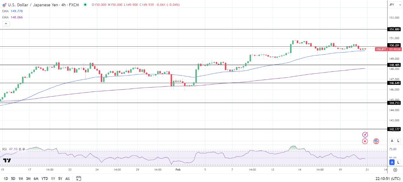 周三(2月21日)亚市,美元/日元短线一度反弹回到150上方,不过美元指数美元追随全球债券收益率下滑,令美元兑日元再度回落至150关口下方,目前交投于149.96附近,但日本1月商品贸易差额总额低于预期,为买盘提供支撑。日本财务省官员Atsushi Mimura表示,正与其他国家沟通慎防外汇干预。
