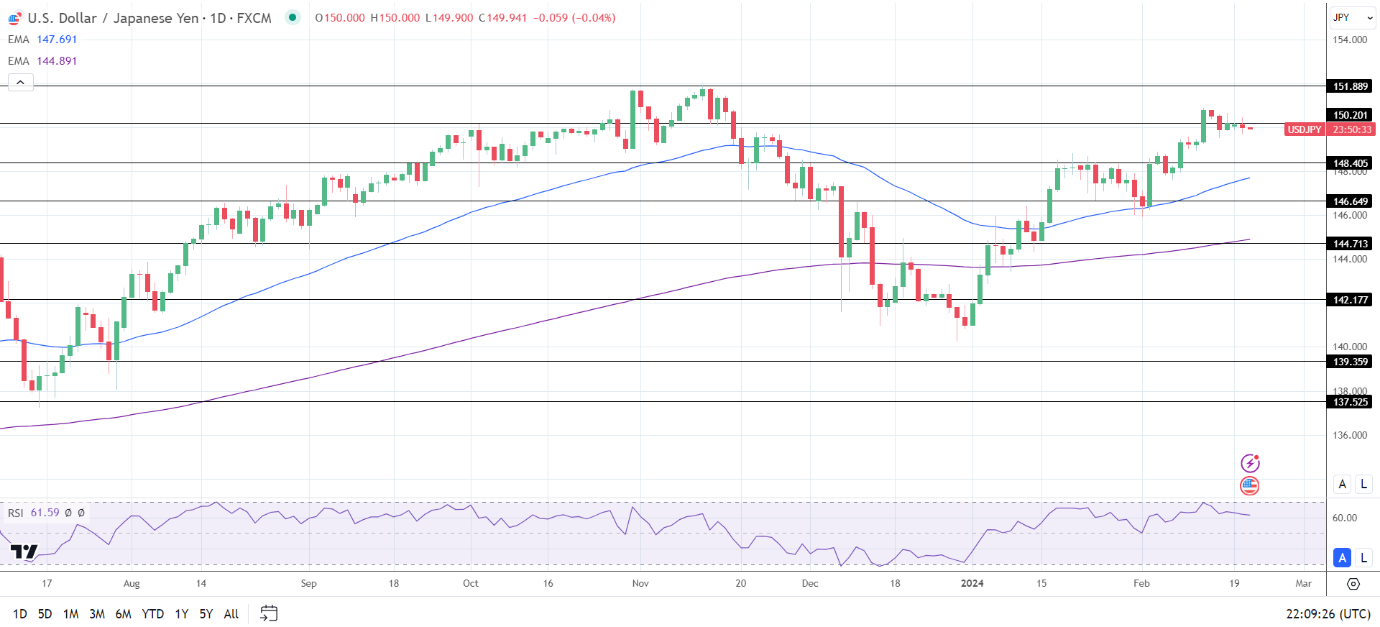 14天RSI为61.59,表明美元/日元在进入超买区域之前将回到151关口。