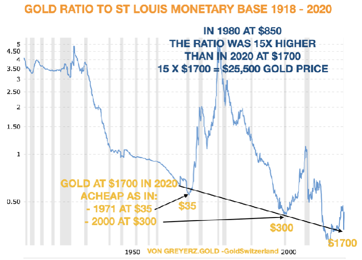 下图显示,相对于货币供应量,2020年初的黄金价格为1700美元,与1971年的35美元和2000年的300美元一样便宜。