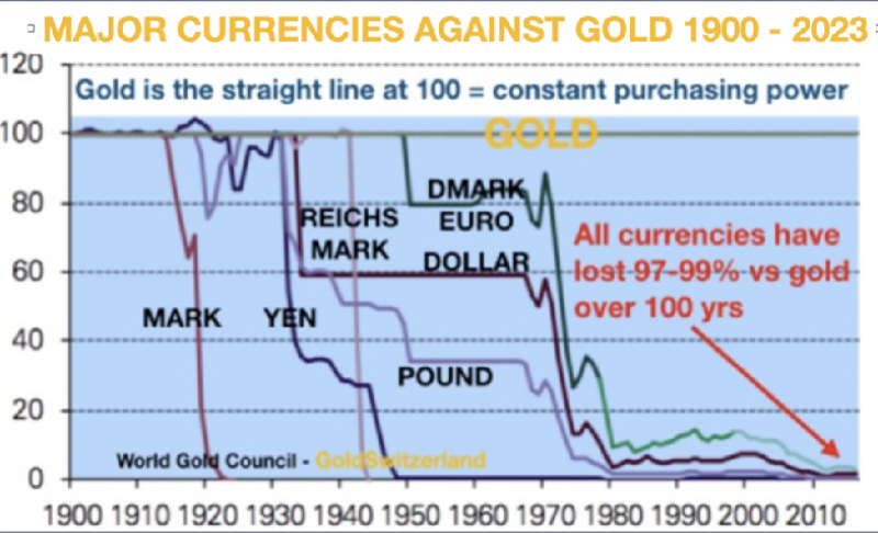 “当您衡量黄金的单位(美元、欧元、英镑等)不断贬值且价值每月贬值时,预测价格水平的目的是什么?投资者需要知道的是,正如伏尔泰在1727年所说的那样,历史上每一种单一货币都毫无例外地走向了零。”