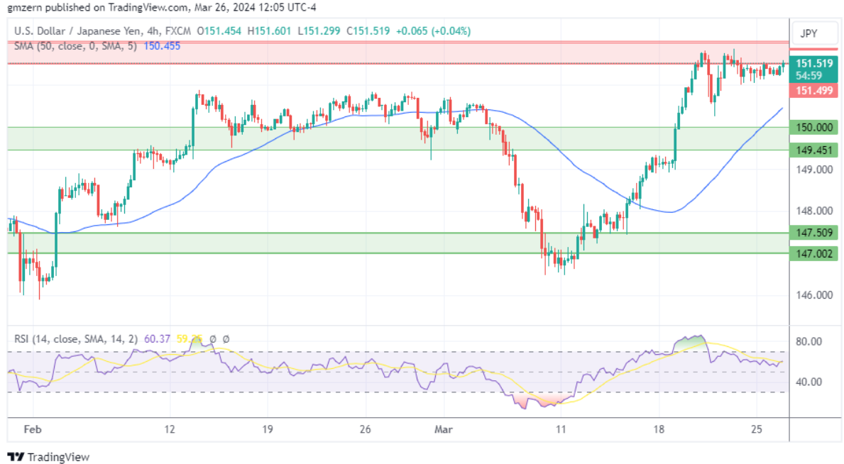 美元/日元仍徘徊在关键阻力位151.50 – 152.00附近。多头担心,如果美元/日元测试152.00水平,日本央行将进行干预。