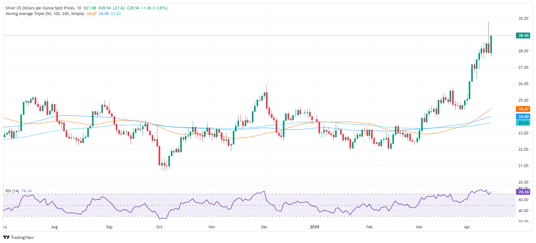 周二(4月16日)亚市早盘,现货白银在周一暴涨逾3%后延续反弹走势,银价刚刚触及关键水平29.00美元/盎司。FXStreet分析师Christian Borjon Valencia最新撰文,对银价技术前景进行分析。