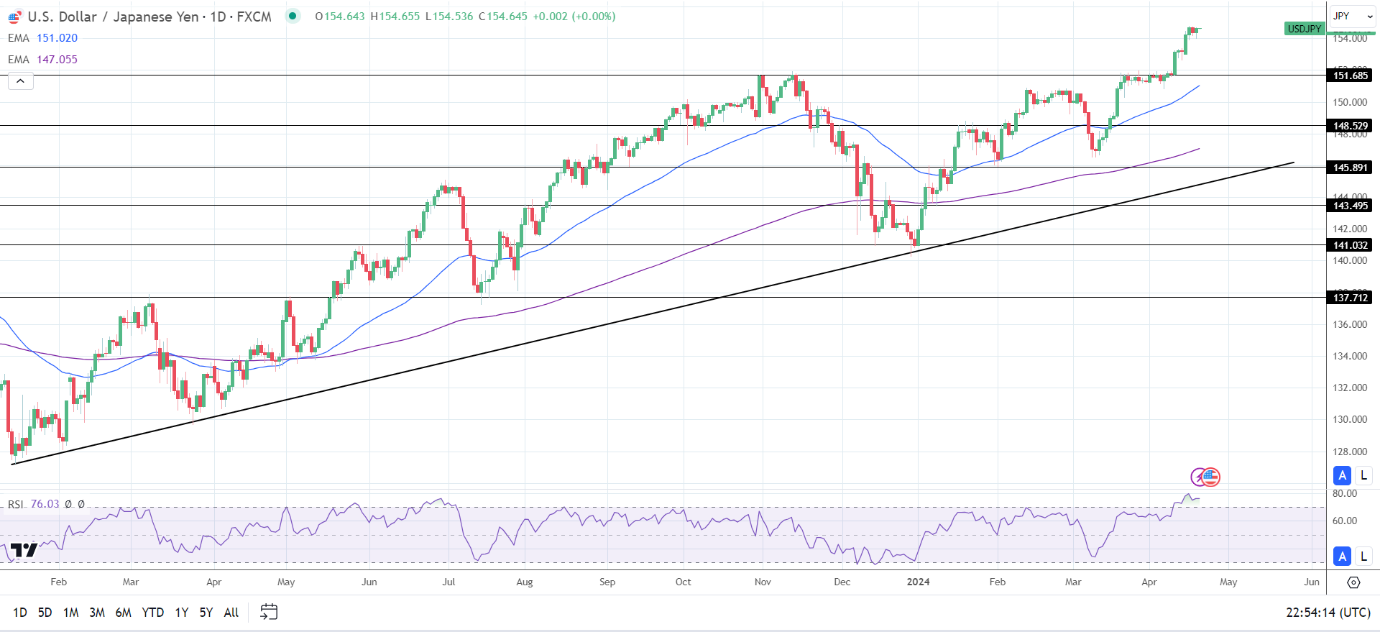 FXEmpire分析师表示,日线图上看,美元/日元突破4月16日高点154.787将支撑其升至155关口。