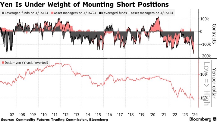 美国商品期货交易委员会(CFTC)的数据显示,截至4月16日,杠杆基金和资产管理公司押注日元走软的合约增至逾17.3万份,为CFTC自2006年追踪该数据以来的最高纪录。