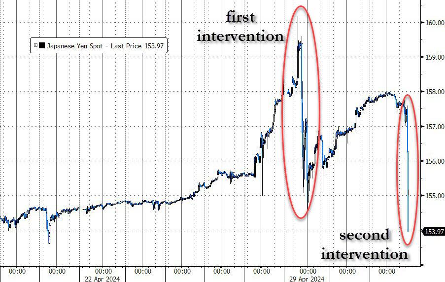 两天前,日元兑美元汇率跌至34年来的最低点160。据报道,当时日本财务省花费了大约5万亿日元(约合300多亿美元),将即将崩溃的日元推至前所未有的水平。大约48小时前,第一次干预的影响已经消退,在美国现金市场收盘后不久,日本财务省似乎再次介入,美元兑日元在几秒钟内暴跌,这是日本在两天内的第二次干预。