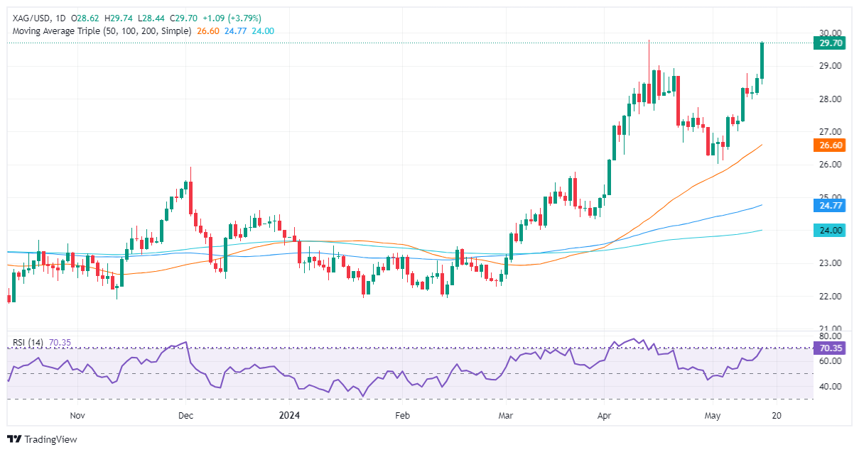 周三(5月15日),受美元大跌推动,现货白银暴涨近4%。周四亚市早盘,银价延续升势,最高触及29.82美元/盎司,为2021年2月份以来新高。FXStreet分析师Christian Borjon Valencia最新撰文,对银价技术前景进行分析。