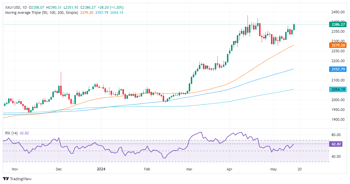 周三(5月15日),受美国CPI数据影响,美元大跌,现货黄金暴涨近28美元,收盘位于2385美元/盎司附近水平。周四亚市早盘,金价延续涨势,目前已经突破2390美元/盎司关口。FXStreet分析师Christian Borjon Valencia最新撰文,对金价技术前景进行分析。
