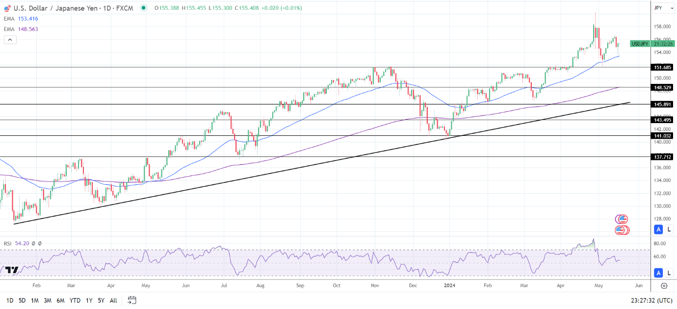 14天RSI为54.20,表明美元/日元将升至4月29日高点160.209,然后进入超买区域。