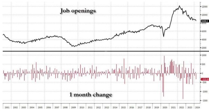 美国3月JOLTS职位空缺848.8万人,创下2021年2月以来最低,大幅低于此前预期的869万人。3月的JOLTS职位空缺数低于媒体调查的几乎所有经济学家的估计,单月下滑32.5万人,创2023年10月以来最大跌幅。