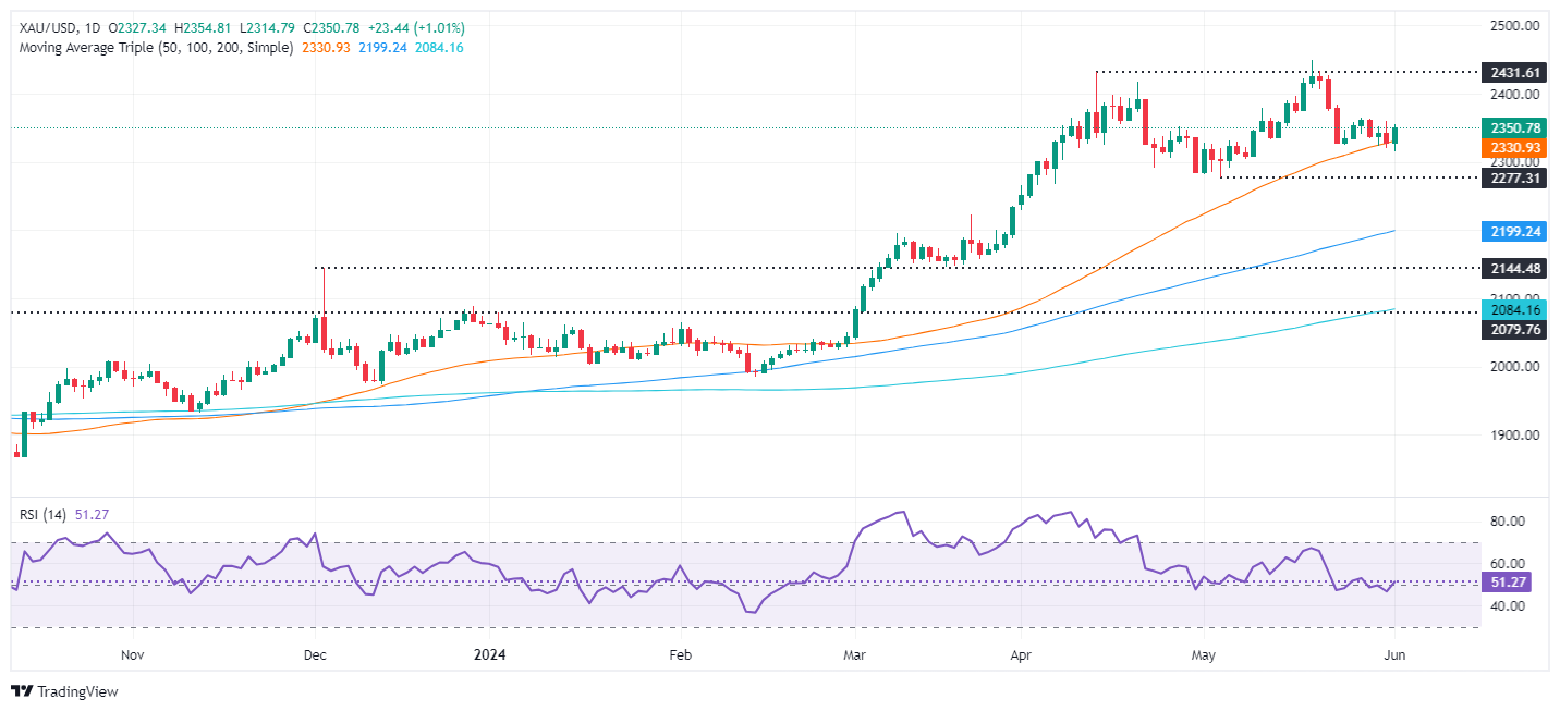 FXStreet分析师Christian Borjon Valencia称,金价从50日简单移动平均线(SMA)2331美元/盎司反弹后,上行趋势保持不变。由于相对强弱指数(RSI)保持在50中线上方,为金价进一步上行打开了大门,动能转向有利于买家的方向。