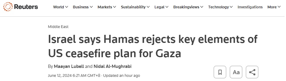 报道指出,哈马斯周二正式对美国提出的停火建议作出回应,以色列称这一回应等同于拒绝。而哈马斯一名官员表示,哈马斯只是重申了目前计划未能满足的长期要求。