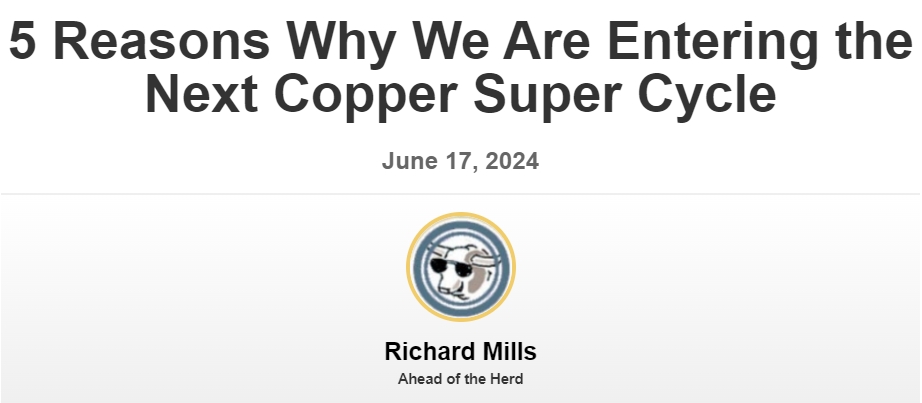 贵金属专家、Ahead of the Herd作者Richard Mills表示,市场即将进入下一个铜超级周期。他表示,尽管价格已达到过去五年来的最高水平,但仍有观点认为,铜和其他大宗商品从未如此被低估。一旦美联储开始降息,美元就会走弱,整个大宗商品市场就会走强。