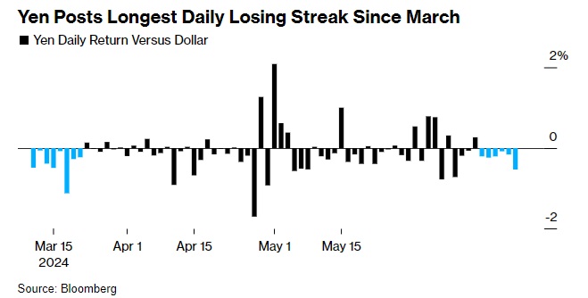 周五(6月21日)有报道称,截至周四,日元创下自3月以来最长连续贬值纪录,加大日本官员将再次出手支撑日元的风险。