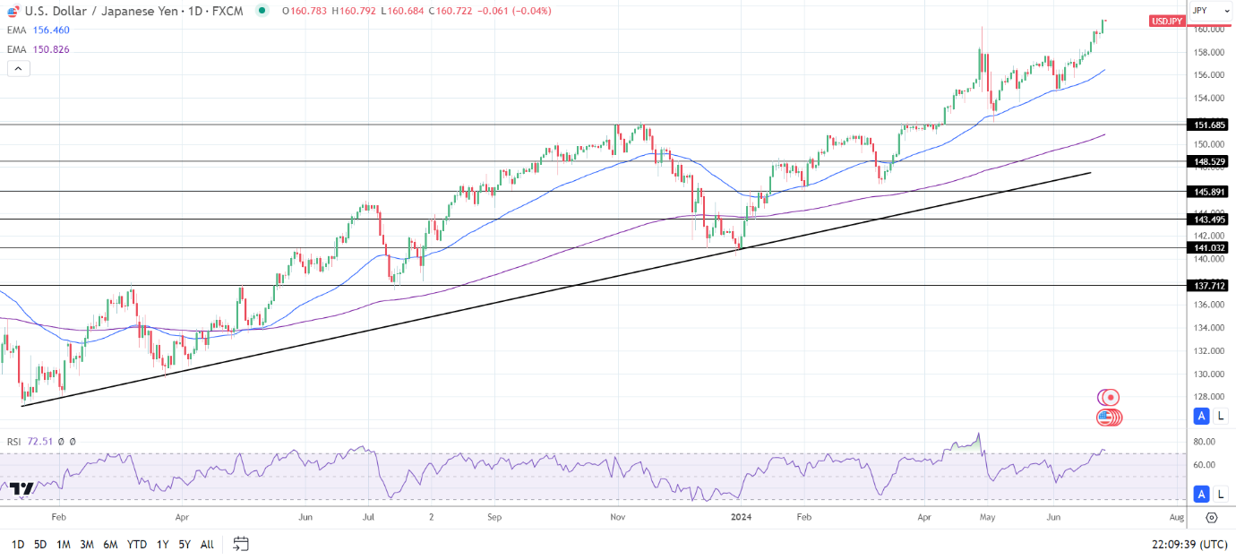 相反,美元/日元跌破160关口可能会让50日均线发挥作用。跌破50日均线可能会让空头在151.685美元的支撑位发起冲击。