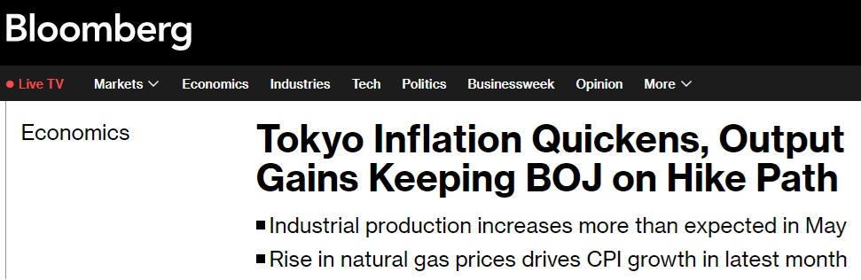 美国彭博周五(6月28日)最新撰文称,在能源价格上涨和5月工业产出增幅高于预期的背景下,东京6月通胀有所抬头,这可能使日本央行考虑最早在7月加息。