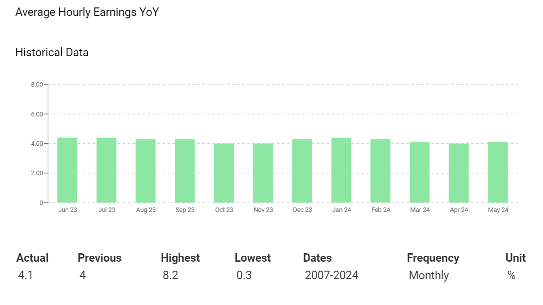 作为背景,美国平均每小时工资在2024年1月同比增长4.4%,然后在4月降至4.0%。美元将对美国就业报告和工资增长预测的偏差做出反应。
