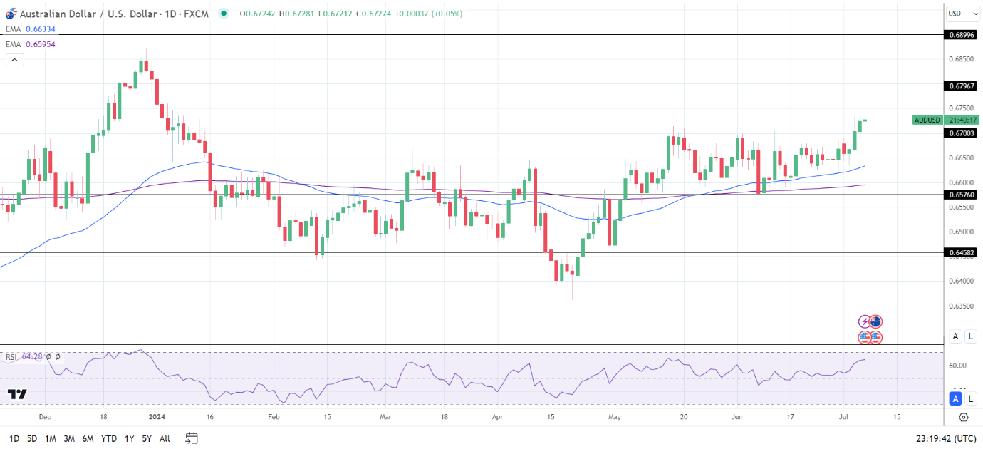 澳元/美元突破0.67500美元关口,将支撑其向0.67967美元阻力位迈进。