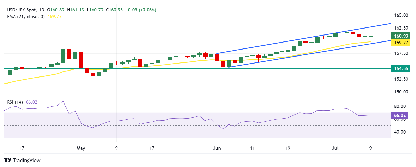美元/日元可能测试上升通道上边界162.55附近的关键阻力位,突破该水平可能会增强看涨情绪,并可能推动该货币对跌向心理阻力位163.00。