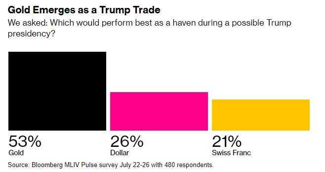 根据美国彭博社的Markets Live Pulse周一(7月29日)最新发布的一份调查,如果特朗普(Donald Trump)重新入主美国白宫,黄金是最好的投资组合对冲工具。