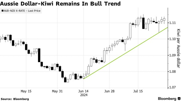 西太平洋银行(Westpac Banking Corp.)驻悉尼的外汇策略主管Richard Franulovich表示:“我们认为澳元/纽元正处于中期看涨重启至更高区间的过程中。然而,短期内必须谨慎的是,第二季度澳大利亚CPI没有为澳洲联储加息提供理由。”