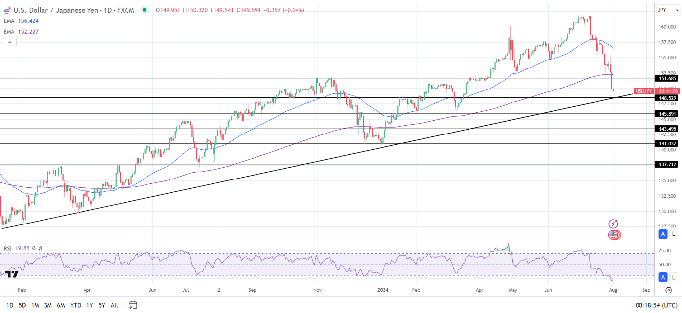 周四(8月1日),美元/日元短线大跌触及148.50后,微幅回升至149.65。日本央行将利率上调至0.25%,达到2008年以来的最高水平,并释出超鹰派信号。美联储则维持利率不变,并且主席鲍威尔释出9月鸽派降息的重要暗示。