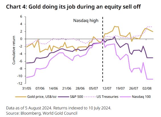 “英伟达是人工智能领域的宠儿,也是美国股市表现最好的公司,该公司将于 8 月底公布第二季度财报,这将限制其他行业领头羊的糟糕业绩,同时其他指数近期也遭遇抛售,”世界黄金协会指出,“这是市场一段时间以来首次显得紧张。尽管第一季度业绩超出预期,但有两件事打消了市场乐观情绪:首席执行官黄仁勋在 6 月和 7 月大量抛售股票,特斯拉、谷歌、亚马逊和英特尔的业绩指??引也不佳。英伟达股价自 6 月触顶以来已下跌 28%,而纳斯达克综合指数较 7 月高点下跌 12%(截至 8 月 5 日)。”