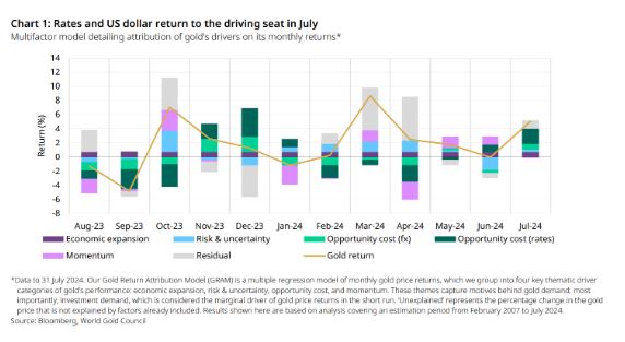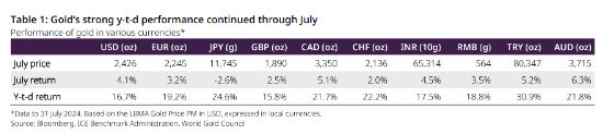 “继 6 月份小幅下跌之后,7 月份金价强劲上涨,收盘上涨 4% 至每盎司 2,426 美元。月中创下历史新高,月底小幅下跌。日元强劲上涨(可能是受套利交易平仓推动)确保了日元成为当月唯一一种黄金未上涨的主要货币。”
