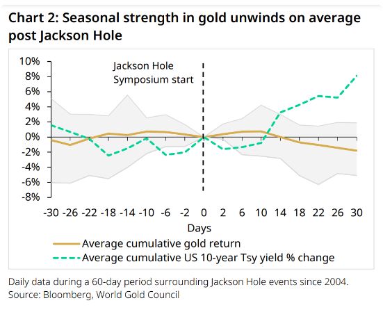 “对于黄金而言,过去十年中,研讨会之后黄金价格平均先是走强,然后在几周后走弱,因为债券收益率趋于走高。”