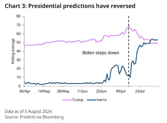 他们表示:“自从拜登总统让位给卡马拉·哈里斯担任民主党候选人以来,民意调查结果已大幅收紧,现在一些预测有利于民主党获胜,”并指出民主党全国代表大会将于 8 月 19 日举行。