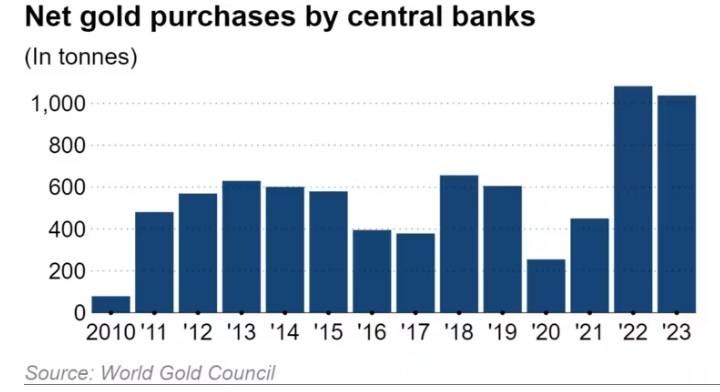 全球各国央行在2023年的黄金净购买量约为1030吨,连续第二年净购买量超过1000吨;此前2022年达到创纪录的1082吨。
