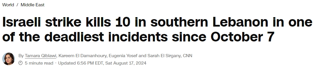 尽管停火谈判持续,但美国有线电视新闻网(CNN)在周六(8月17日)消息称,黎巴嫩卫生部称,以色列的袭击在黎巴嫩南部的纳巴提耶造成至少10人死亡,促使真主党向以色列发射了一连串报复性火箭弹。