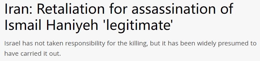 以色列尚未表态对此次杀戮负责,但人们普遍推测以色列实施了此次杀戮。中东地区已经处于警惕状态超过两周,担心伊朗可能直接袭击以色列,以报复哈尼亚遇刺事件。