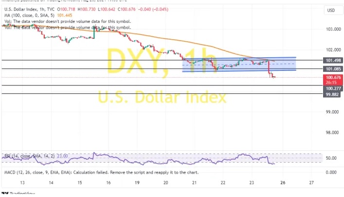 Kitonyi在文章中写道,美元指数从约101.50的日高回落至约100.67。美元指数已经完成从横盘通道的向下突破。