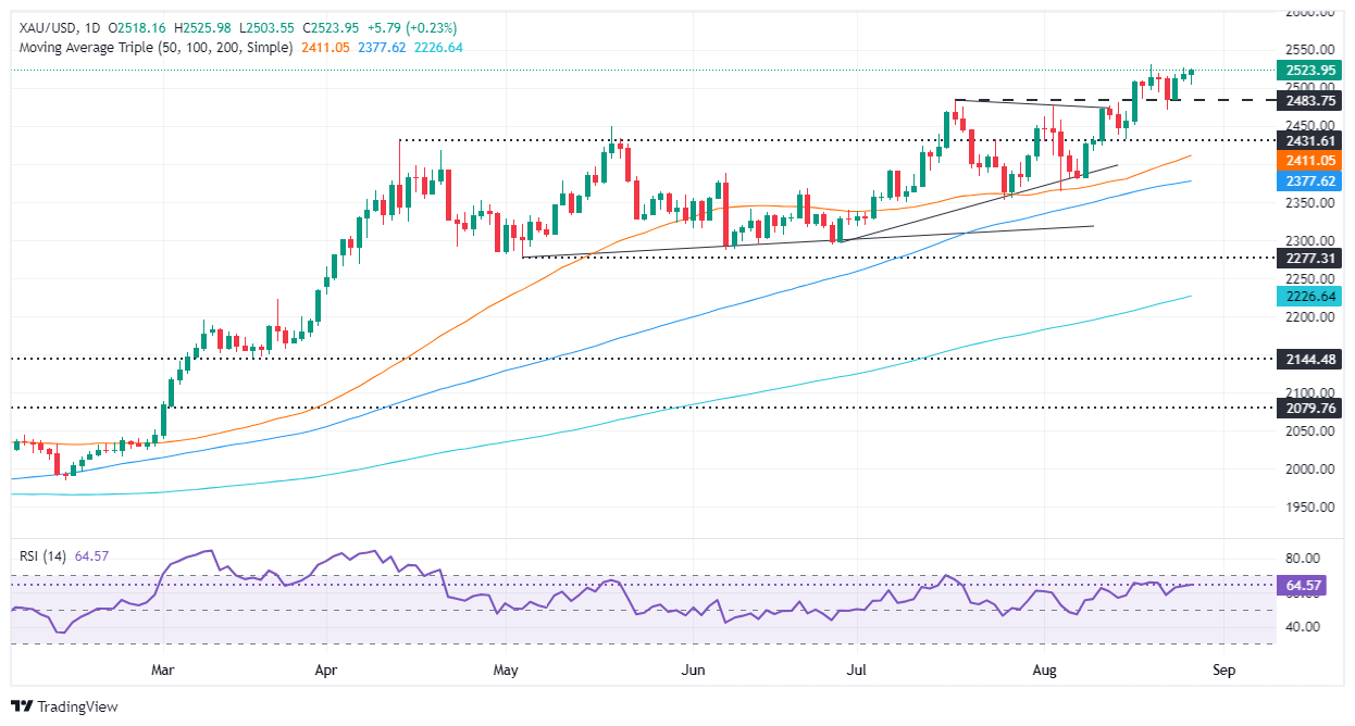 周二(8月27日)美国交易时段,现货黄金自2503美元/盎司附近水平突然大幅攀升,在周三亚市一度触及2528.97美元/盎司,目前交投于2519.63美元/盎司附近。FXStreet分析师Christian Borjon Valencia周三撰文,对金价技术走势进行分析。