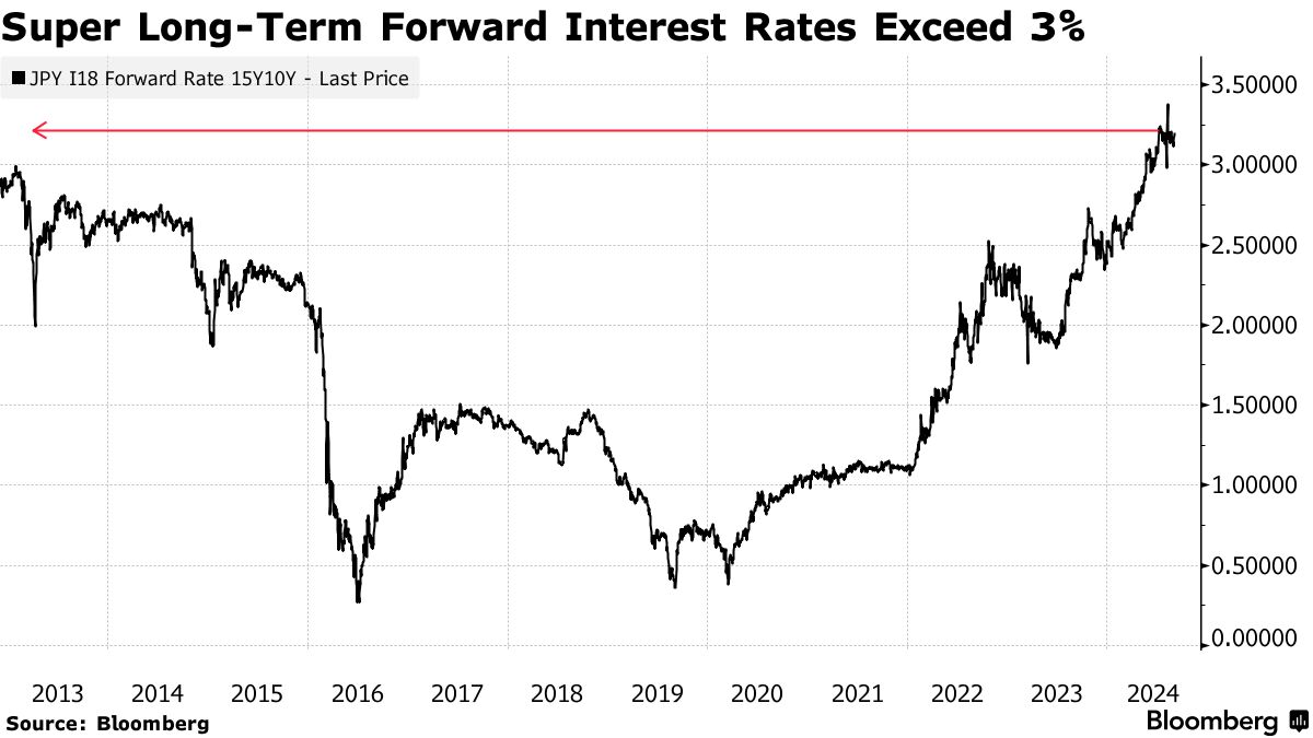 自日本央行在2013年启动激进量化宽松政策以来,超长期债券的远期利率首次超过3%。