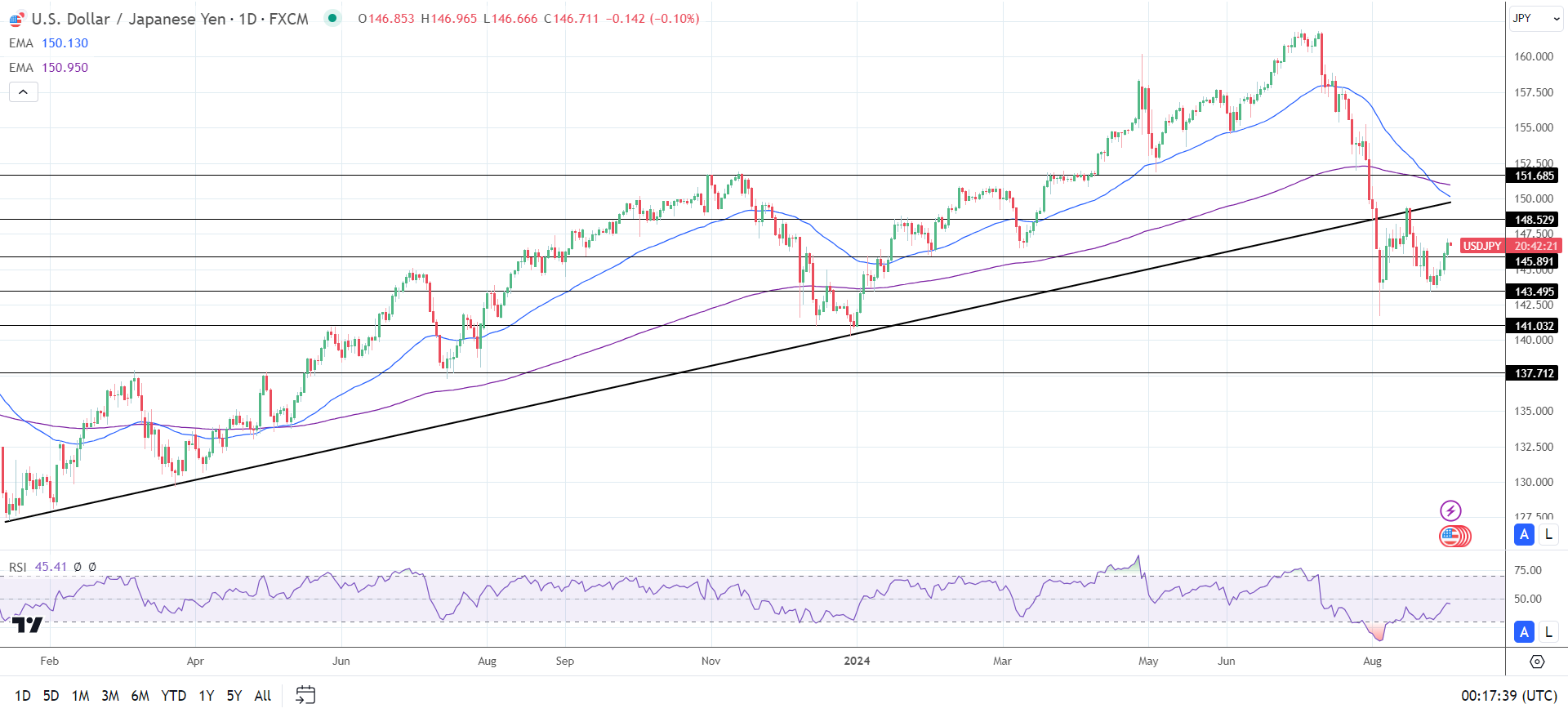 14天RSI为45.41,表明美元/日元跌破143.495支撑位,然后进入超卖区域。
